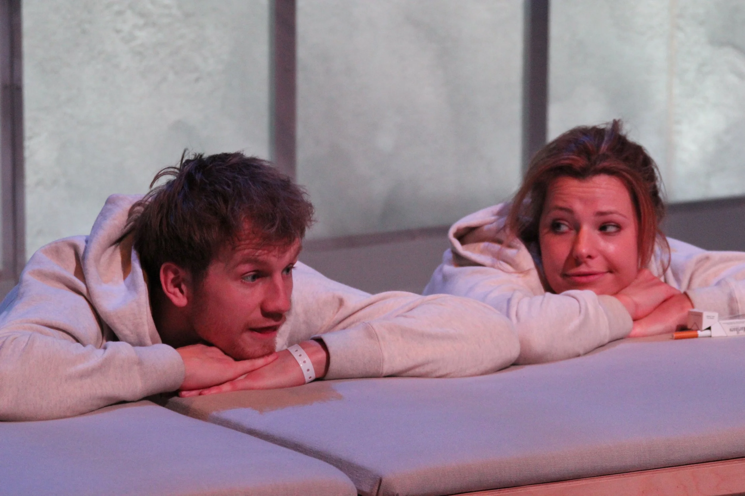 Admissions Procedure sees two young volunteers enter a drugs trial, changing into clinical outfits, undergoing tests and measurements, and given their initial drug or placebo dosages in a very tightly choreographed routine which took much practice to perfect. The rhythmic breaks all contain specific sounds and actions as data is entered into the doctor's iPad and relayed by video projection.